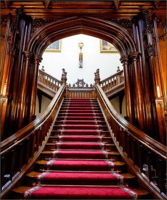 The hall is central and gives access to the elegant drawing room, the blue-and-white ballroom, and the library with bookcases based on the original designs and restored in the on-site workshop. Most of the original bookcases, together with the books, were destroyed in the fire. The wallpaper was based on one of Pugin's designs for the Houses of Parliament and the ceiling has recently been repainted in the original colours. The principal staircase opens off the great hall, under another vaulted ceiling hung with portraits of the Mowbray and Stourton families.