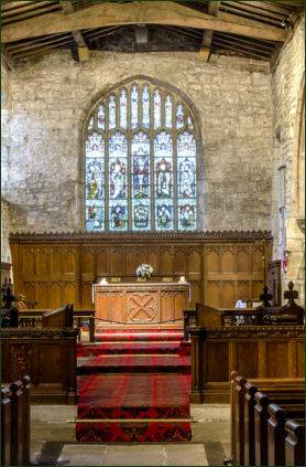 The pulpit is late Jacobean work and has a soundingboard dated 1718. In the east end of the north aisle is an old reading desk which holds a chained New Testament, and over the font is a carved tabernacle-work canopy dating to the late fifteenth century. In the floor of the Lady chapel is a slab to Elizabeth Blackburne dated 1688.