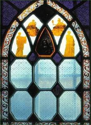 The stained glass windows which are described in 'Shirley' (pictured right) still remain in the dining room. 'Those windows would be seen by daylight to be of brilliantly-stained glass - purple and amber the predominant hues... ' - Shirley. The governess' school and sitting room displays books and a globe for teaching, an educational history jigsaw and a very old Fox and Geese board game. The elegant main bedchamber contains fine mahogany furniture from the late eighteenth and early nineteenth centuries.