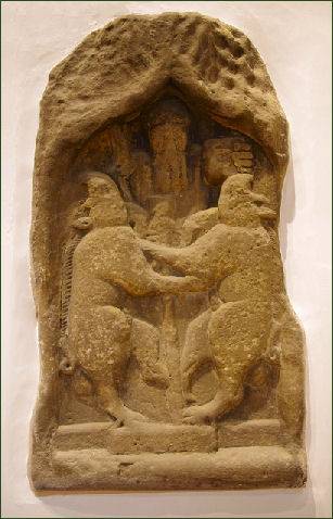 In the north transept are two recessed tomb niches which were added in 1380, one of these contains the fourteenth century recumbent effigy of the priest Robert de Martham, vicar of Gainford. The other niche has the fourteenth century carved grave slab of a priest, decorated with a floriated cross. Set on the wall nearby is a fragment of a fourteenth century sculpture depicting St Anthony the Egyptian Eremite, flanked by a pair of upright boars, which may have formed part of a larger tombstone.