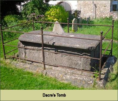 The graveyard of All Saints Church at Saxton contains seventeenth century tomb of Lord Dacre with a modern memorial stone. The inscription on the tomb reads, 'Here lies Ralph Lord of Dacre and Gilsland, a true soldier valiant in battle in the service of Henry VI, who died Palm Sunday 29 March 1461, on whose soul God have mercy'. This is not just the resting place of Lord Dacre, but also his horse. In 1861 the skull of a horse was unearthed close to the tomb, legend relates that Lord Dacre was buried upright, astride his horse.